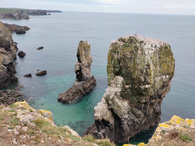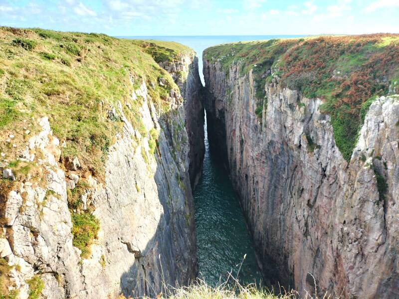 St. Govan Church, Elegug Stacks, Green Bridge, the Couldron en Huntsmans Leap. Wij hebben dit in 2 delen gedaan maar ook goed op een dag te doen. Circa 4 uur nodig v.v. Vanaf of St. Govan of vanaf Green Bridge. Maar let op: plan dit bij voorkeur in op een weekend. Door de weeks zijn er meestal militaire oefeningen en dan is de toegang, zowel met auto als te voet, afgesloten. Je kunt het zien aan de rode vlaggen.