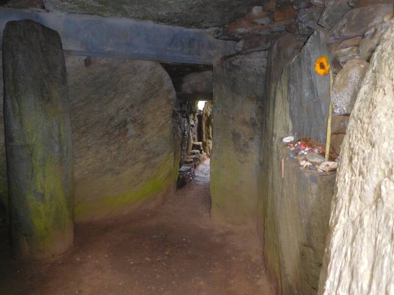 Van de vele mogelijkheden hebben we 2 bezocht. Te weten Bodowyr, een menhir en de Burial Chamber Bryn Celli in Llanddaniel. Deze is geheel in ere hersteld zoals het er ooit uit gezien heeft. Dit heeft veel weg van onze hunebedden. Bij de parkeerplaats is ook nog een rest van een woning uit die tijd, 3500-4000 jaar geleden, te zien. Daarvoor waren we in het dorp met de langste naam. Afgekort Llanfair.